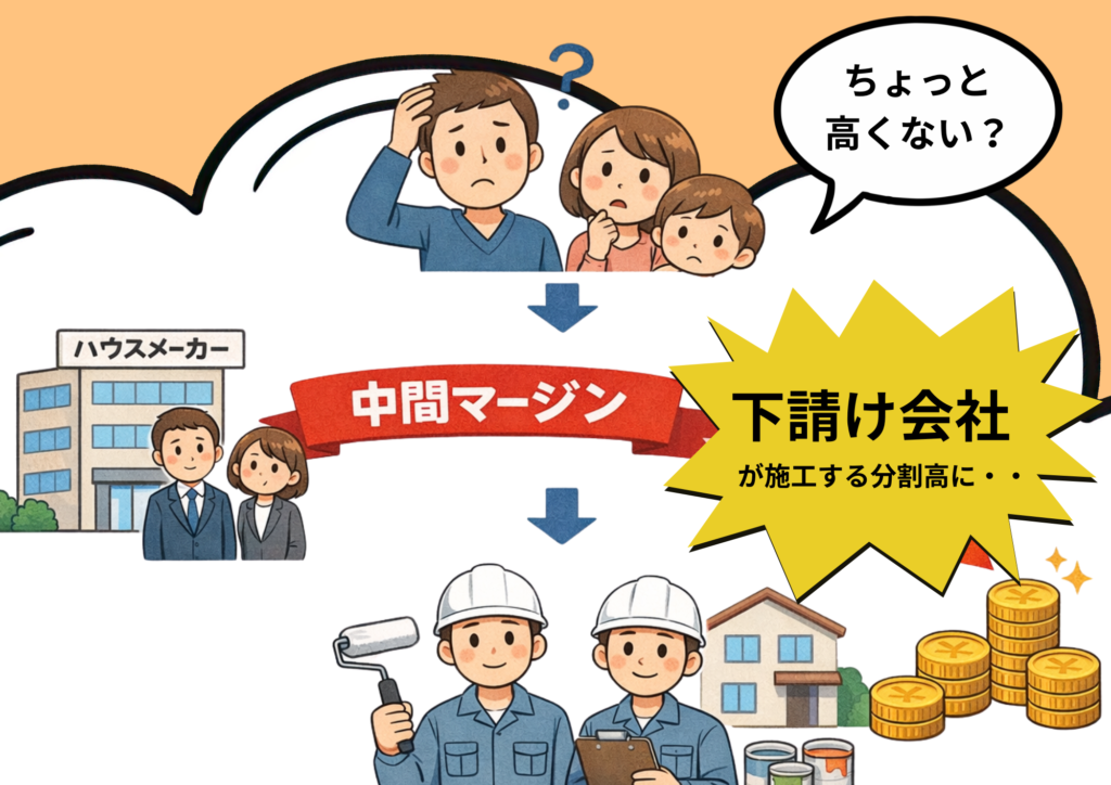 これは、多くのハウスメーカーが自社での施工ではなく、提携業者(下請けの業者)が施工を行うからです。