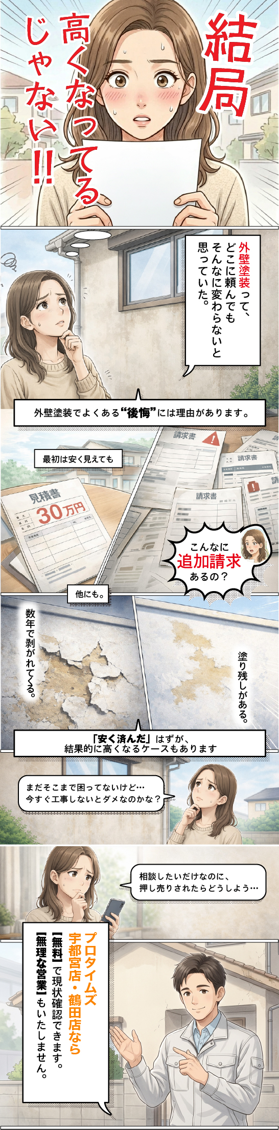 スタッフブログ 【外壁塗装】安い業者が結局高くなってるじゃない! 2026年03月30日(月) お問い合わせ 無料 ご相談 人気記事 前の記事へ 次の記事へ 一覧に戻る カテゴリー イベント情報 カバー・板金工事 カラー リフォーム工事 助成金・火災保険 塗料 業者選び・お見積 現場ブログ 豆知識 防水工事 [ピックアップ] お家の健康診断 外壁塗装のトラブルがなくならない理由 見積書の見方 ショールーム予約