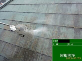 屋根の高圧洗浄です。塗装前に汚れなどを落としています。