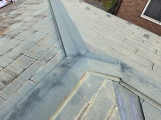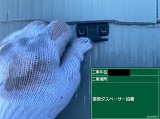 スレート屋根なので下塗りの後、タスペーサーで縁切りをしています。