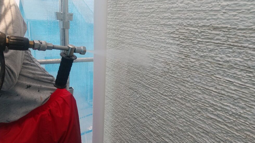 足場組立後、屋根・外壁の高圧洗浄を行います。旧塗膜や藻・苔などの汚れを除去し、塗膜の密着性を向上させます。