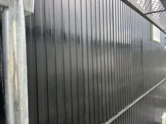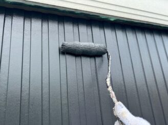 外壁塗装の中塗りです。使用色は8201.シルキーホワイト、8079.チャコールです。