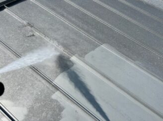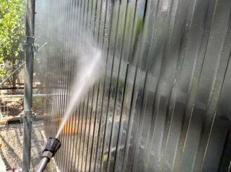 足場組立後、屋根・外壁の高圧洗浄を行います。