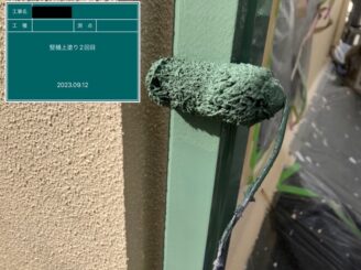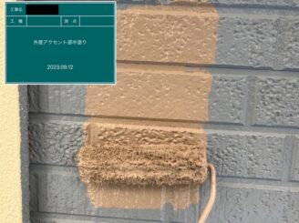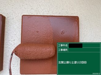 玄関側の外壁塗装の上塗りです。使用色は8088.モカです。