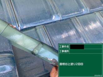 屋根の谷部分の塗装です。中塗り・上塗りの2回塗りを行っています。