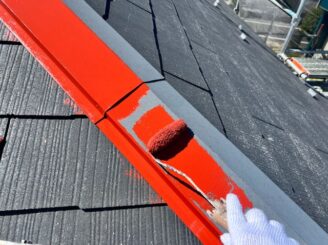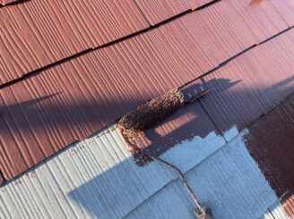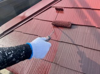 屋根塗装の中塗りです。使用色は9118.バーガンディです。