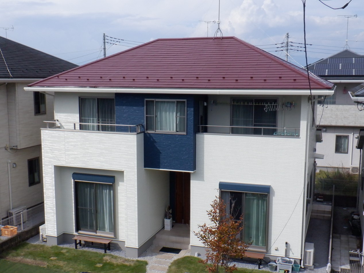使用色はこちら→屋根:9118.バーガンディ|外壁:9020.エクリュ、8108.マウンテンブルー