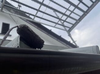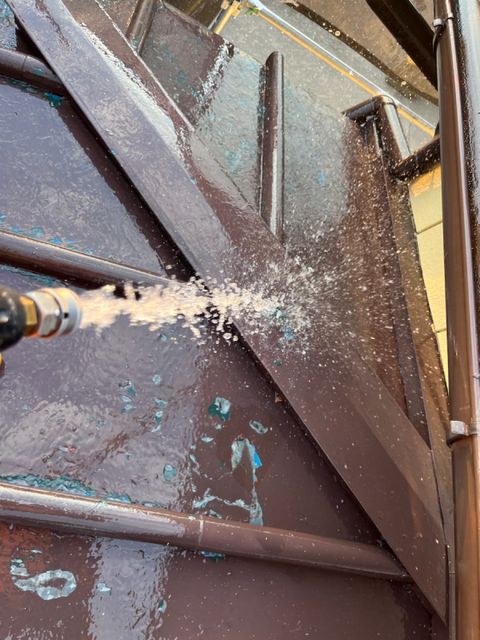 足場組立後、屋根・外壁の高圧洗浄を行います。旧塗膜や藻・苔などの汚れを除去し、塗膜の密着性を向上させます。