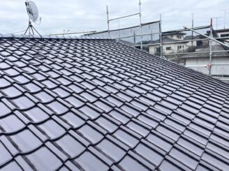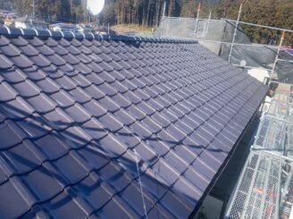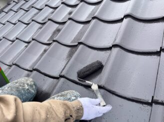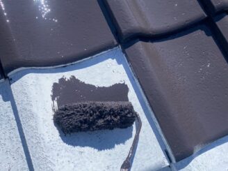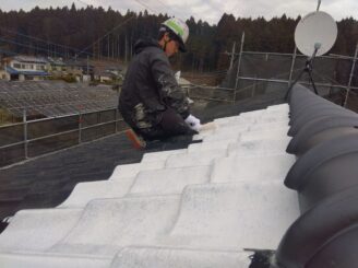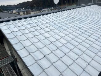 足場組立後、屋根・外壁の高圧洗浄を行います。旧塗膜や藻・苔などの汚れを除去し、塗膜の密着性を向上させます。