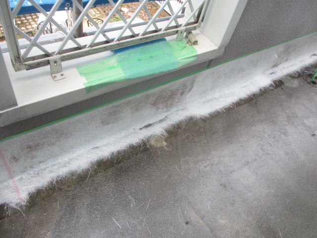 このガラスマットは次に塗る防水材の補強となります。ガラスマット無しだと防水材は簡単に割れてしまうため、このガラスマットに防水材を浸み込ませて強度を高めます。